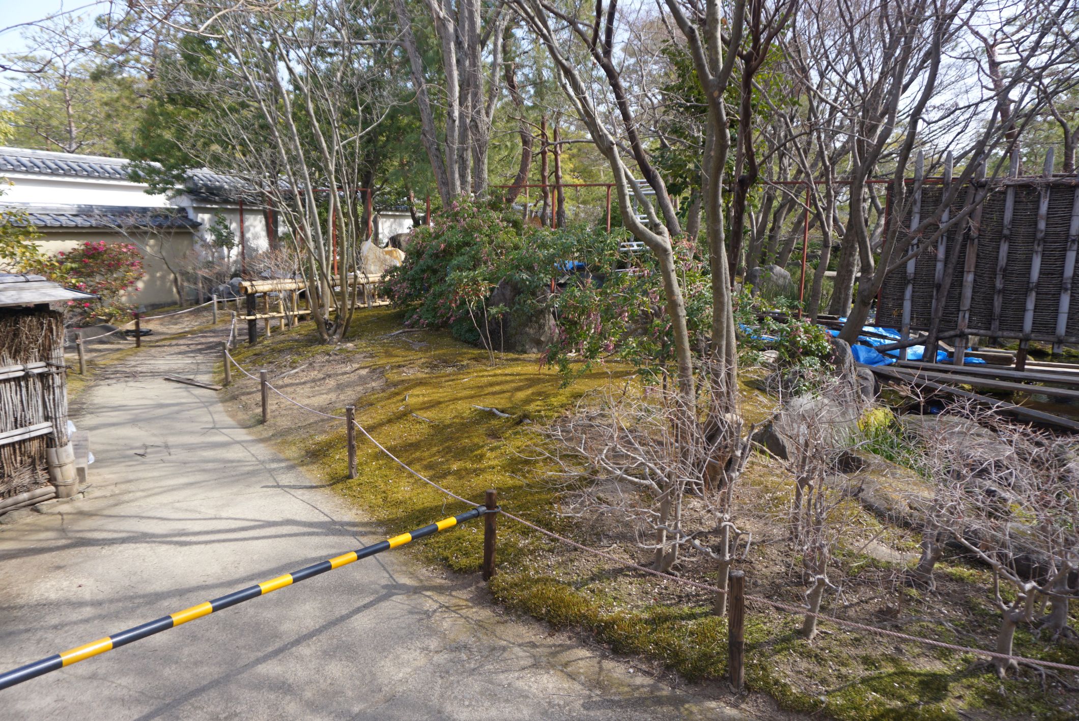 「夏木の庭」「松の庭」間の竹垣(桂垣)の補修作業、及び「松の庭」の剪定作業に伴い、下記のエリアで一部通行止めを行います。