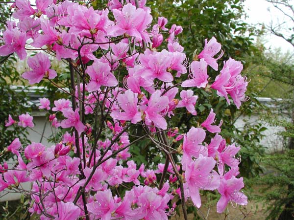 葉に先立って、枝先に赤紫の明るく上品な花を1~3個咲かせます。