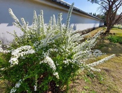 新枝の先に半円形の花序をつくり、円形5弁の小花が密集する。