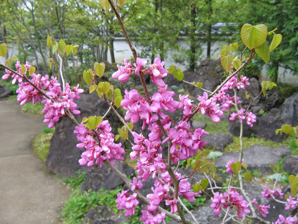 葉に先立って、枝先に赤紫の明るく上品な花を1~3個咲かせます。